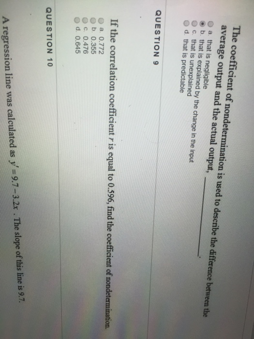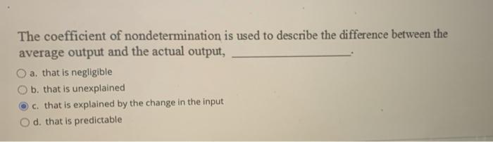 That is predictable O b. 1the coefficient of nondetermination is used to describe the difference between the average output and the actual output-------athat is predictablebthats explained by the change in the inputcthats negligibledthat. QUESTION 11 The coefficient of nondetermination is used to describe the difference between the average output and the actual output O a.