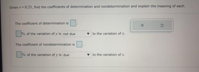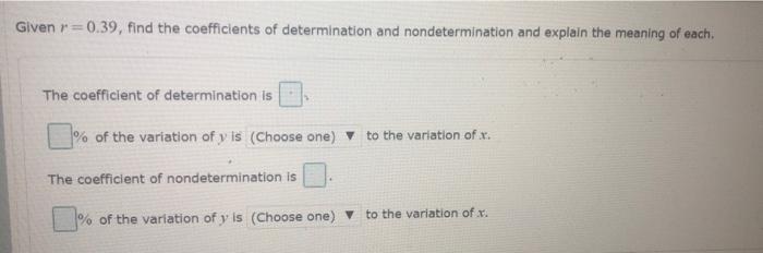 Math Advanced Math QA Library Given r 07 find the coefficients of determination and nondetermination and explain the meaning of each. Is a statistical method used to describe the nature of the relationship between variables.